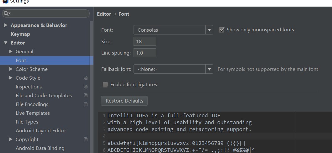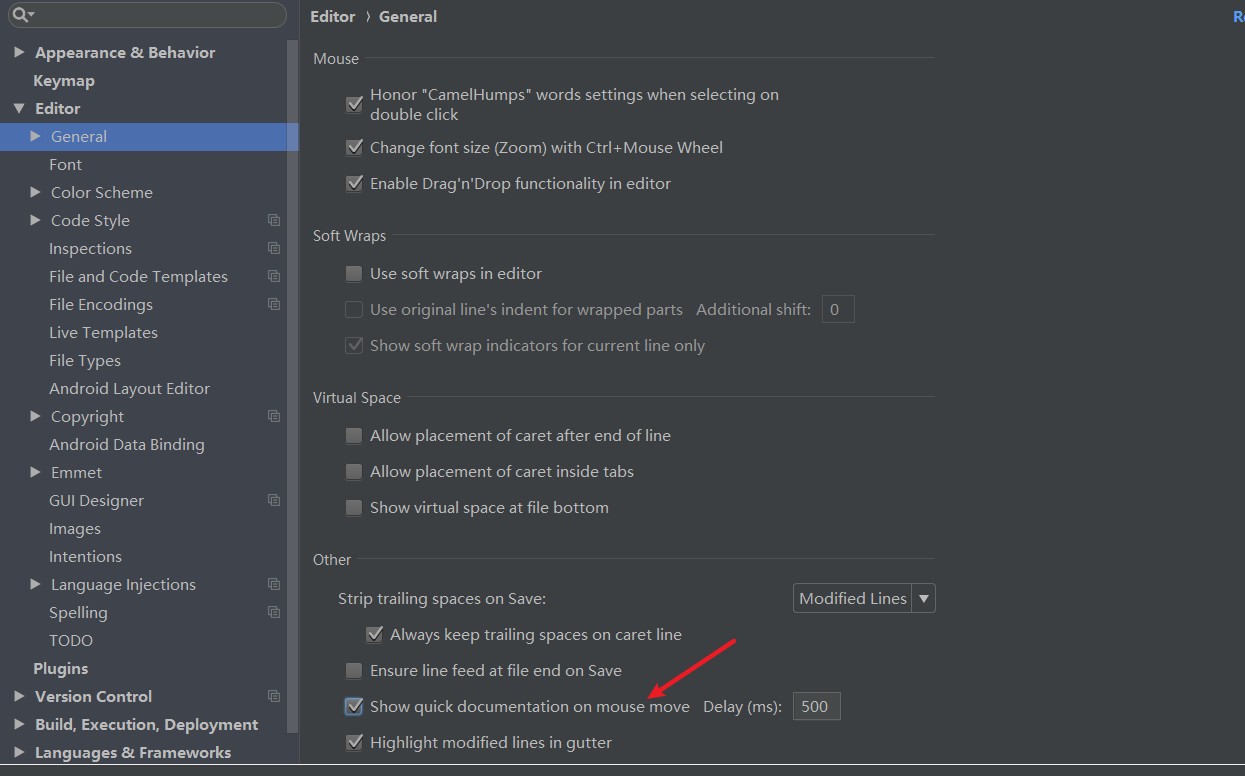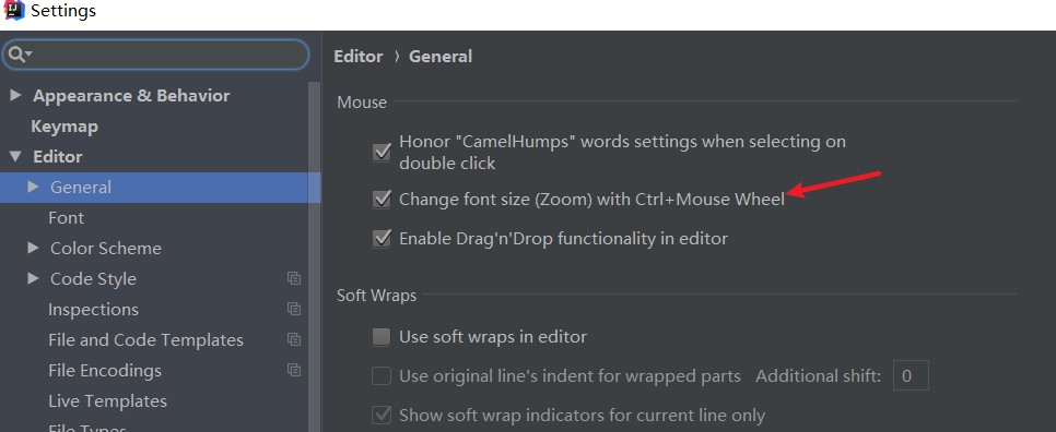 - 设置鼠标滚轮修改字体大小,我们可以勾选此设置后,增加Ctrl + 鼠标滚轮 快捷键来控制代码字体大小显示。