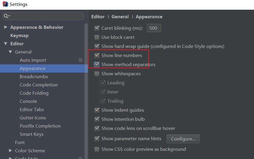 - 如上图红圈所示, 可以 勾选 Show line numbers :显示行数。